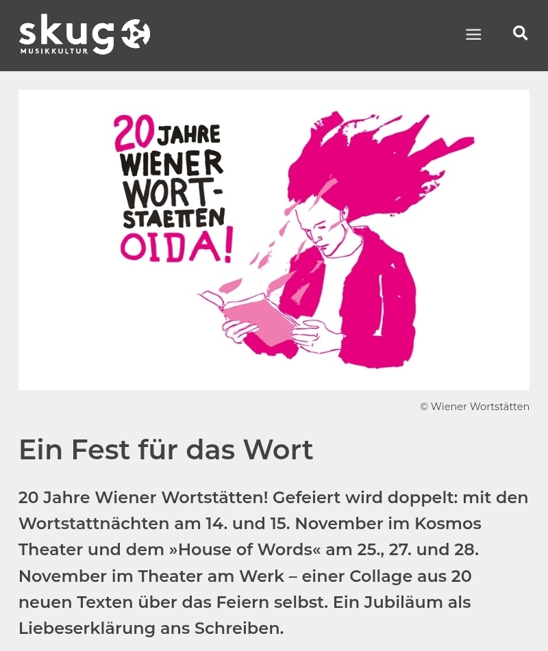 Wir kommen mit dem Lesen schon kaum mehr nach, so viele tolle Artikel werden über die WIENER WORTSTAETTEN verfasst. Ebenso im skug Magazin für Musik und Kultur!