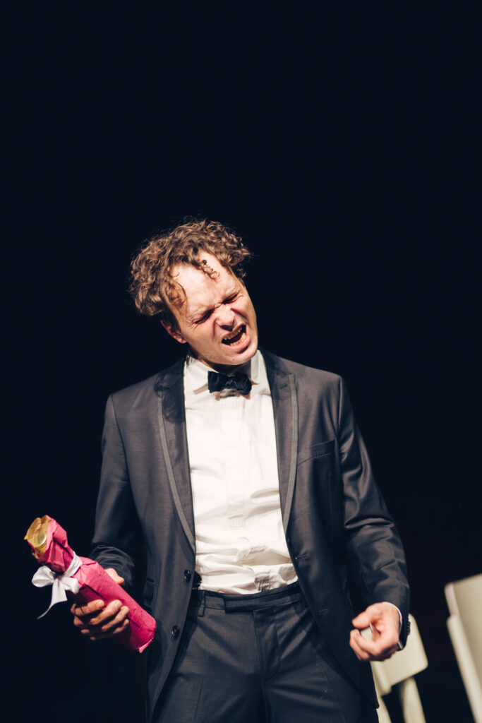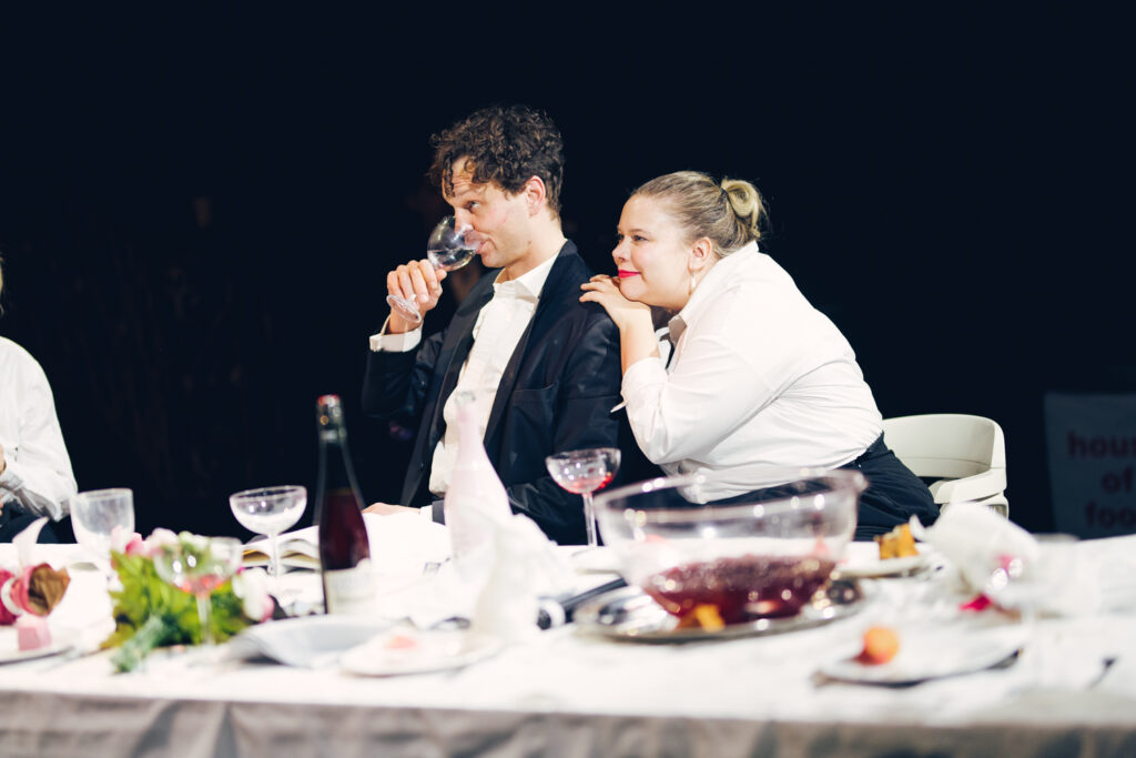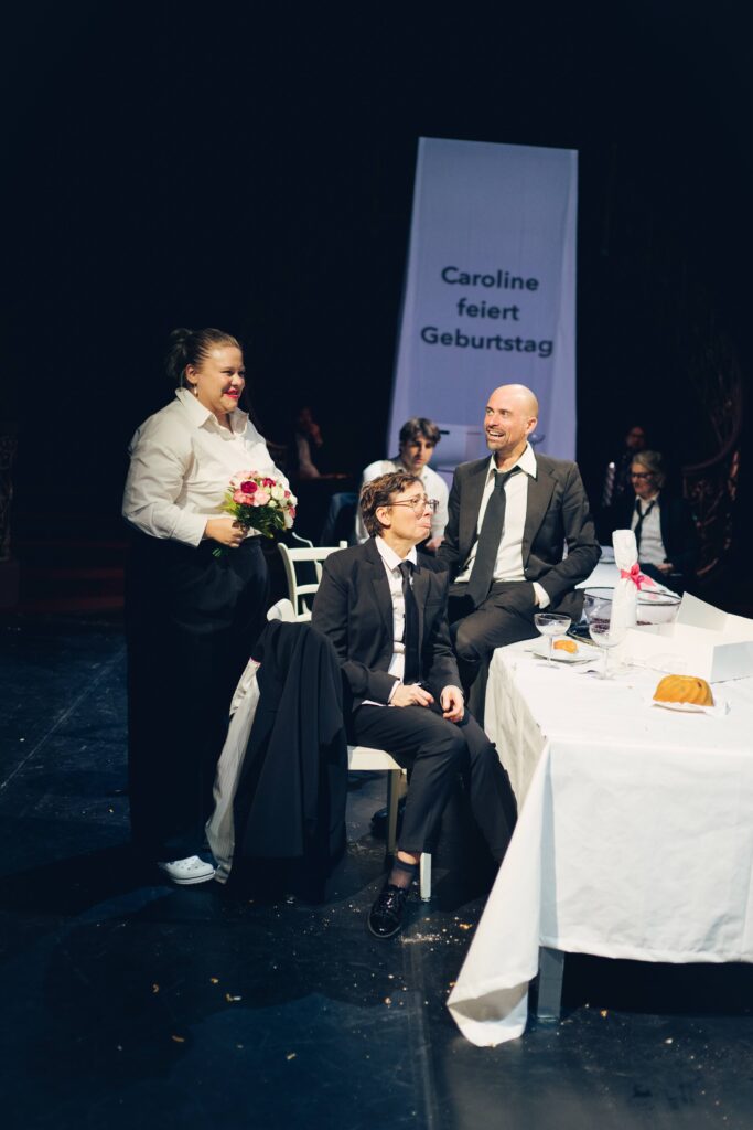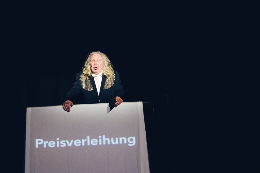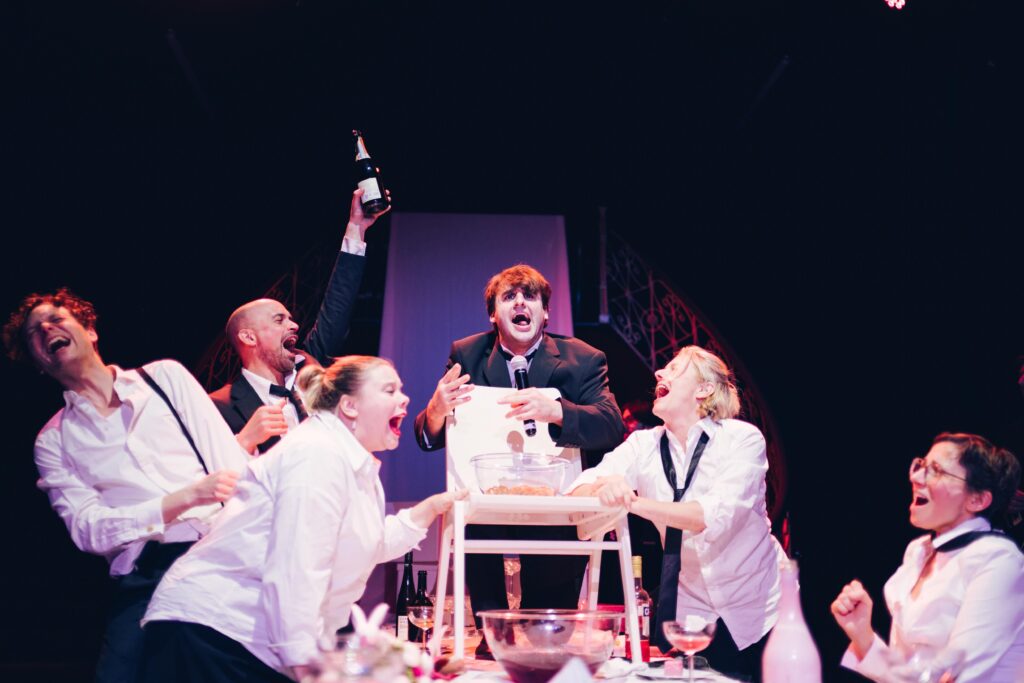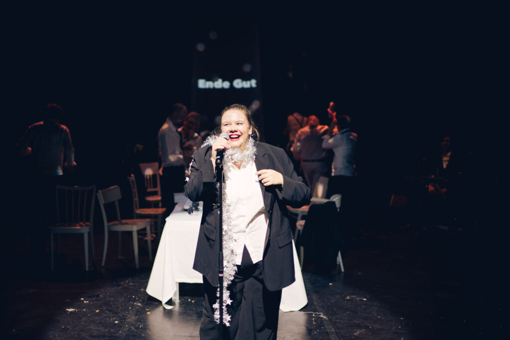 Der rote Faden für die Stücke ist der eines Fests. Denn es gibt immer etwas zu feiern. Aus ganz unterschiedlichen Gründen und diversen Anlässen. Vom Geburtstag über die Beförderung zur Revolution. Vom Schulabschluss zum Erhalt der österreichischen Staatsbürgerschaft bis zum Leichenschmaus. Oder eben die Premiere eines neuen Stücks, um nur einige Gelegenheiten zu nennen. Die Autor*innen schreiben Monologe, Minidramen, Reden, Songs und Szenen, in denen unter anderem ein Theatergott, ein Buckelwal, Playmobilfiguren, Totgeglaubte, Neugeborene und Hunde auftreten.